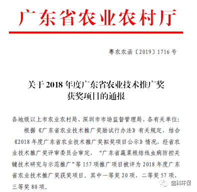 我司作為華南農(nóng)業(yè)大學(xué)合作單位之一,參與“修復(fù)農(nóng)田土壤污染的能源作物品種篩選及其配套技術(shù)應(yīng)用項(xiàng)目”取得了良好的綜合效益,根據(jù)《廣東省農(nóng)業(yè)技術(shù)推廣獎(jiǎng)勵(lì)試行辦法》有關(guān)規(guī)定,經(jīng)省農(nóng)業(yè)技術(shù)推廣獎(jiǎng)評(píng)審委員會(huì)審定,該項(xiàng)目獲得2018年度廣東省農(nóng)業(yè)技術(shù)推廣二等獎(jiǎng)(粵農(nóng)農(nóng)函〔2019〕1716 號(hào))。